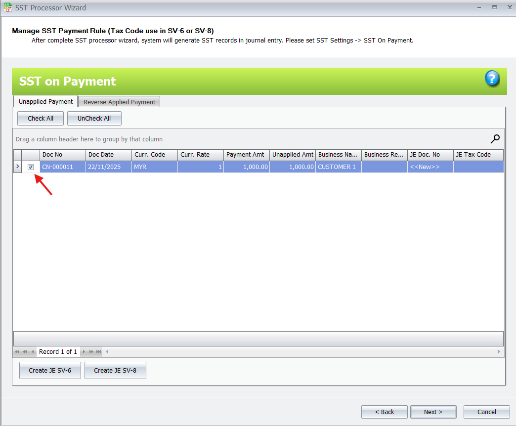 1. You need to tick the document (O/R or CN) to process the SST on Payment.