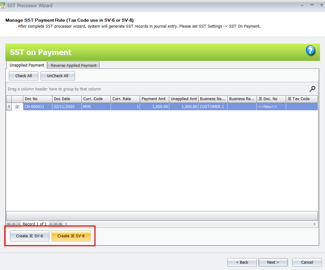If you have an advance payment when running the SST Processor, the system allows you to generate SST on Payment for 6% or 8%.