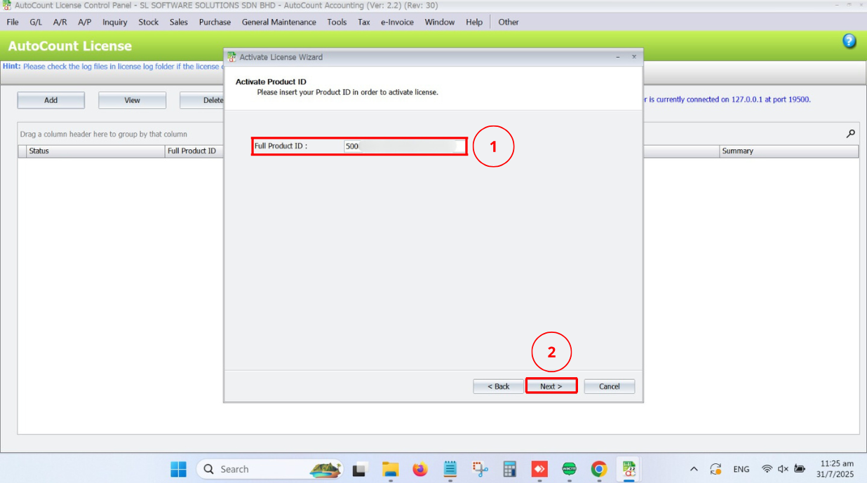 1. Input your Full Product ID (provided by AutoCount Dealer).