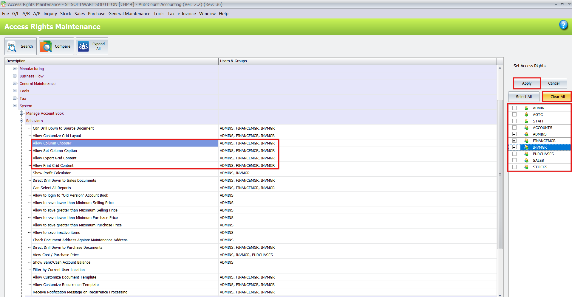 You can control which users have permission to modify or export data using Access Rights Maintenance. To access these settings, go to Tools > Access Rights Maintenance.