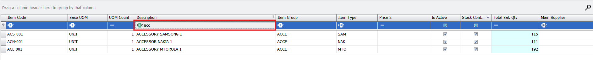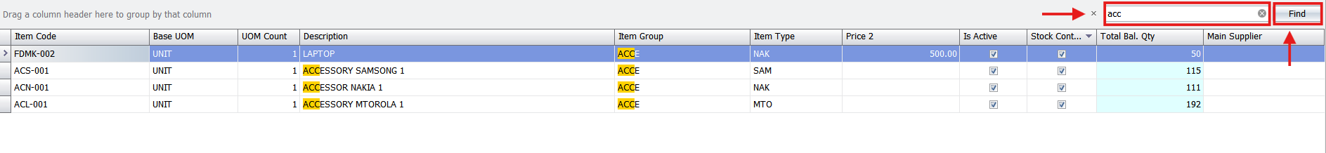 The Find Panel: This tool allows you to type keywords or amounts (e.g., “acc”) to instantly search the entire screen for matching data across all columns.