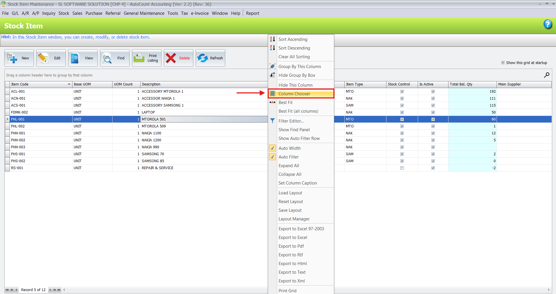 The Column Chooser is available in most modules that utilize grid views, including critical areas like Stock Items, Sales Invoices, Purchase Orders, and General Ledger transactions.