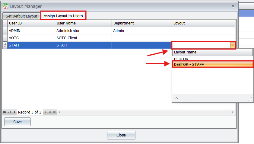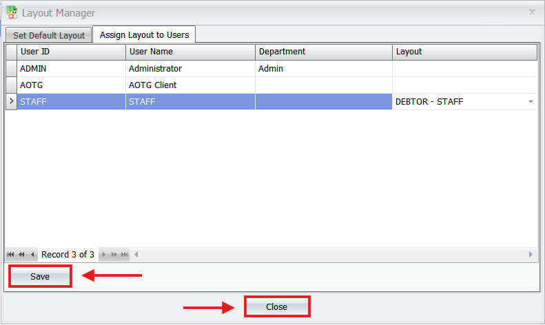In the Layout Manager window, you can assign this specific layout to individual users. Click Save and Close.
