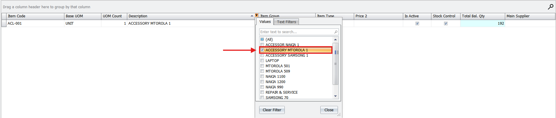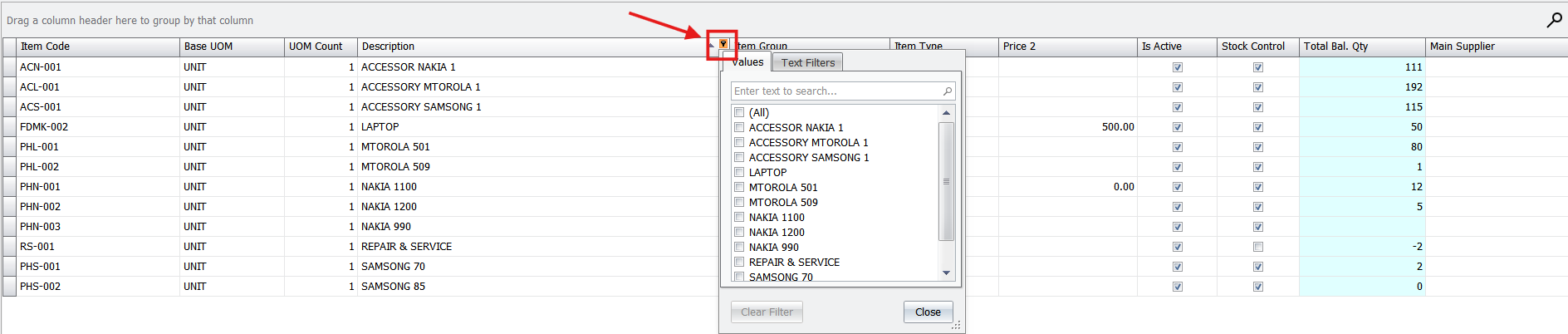 - Group Filtering: Click the small triangle (filter icon) on any column header to filter records by specific groups, values, or even date ranges.