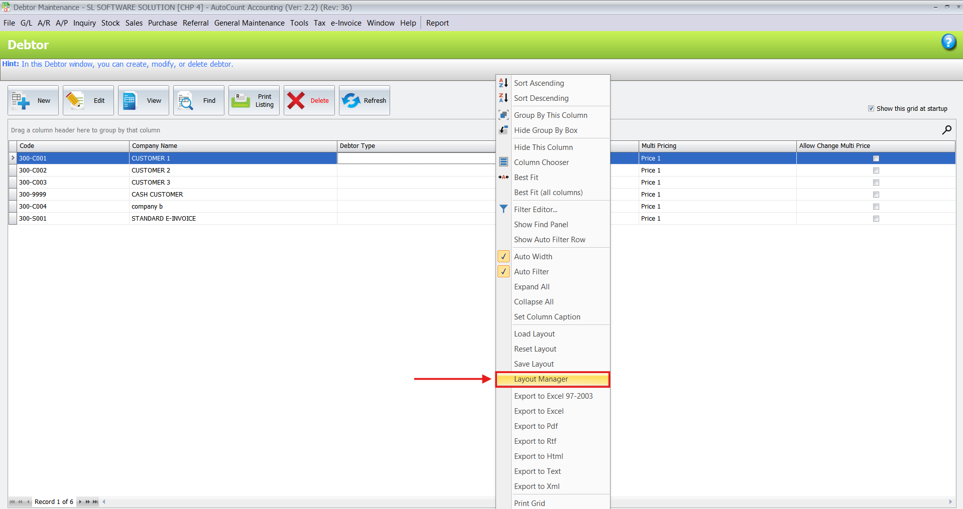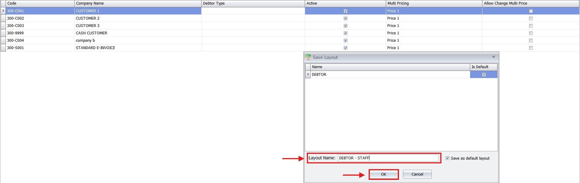 Right-click on the column header and select “Save Layout.” Give it a recognizable name (e.g., “Debtor – Staff”).