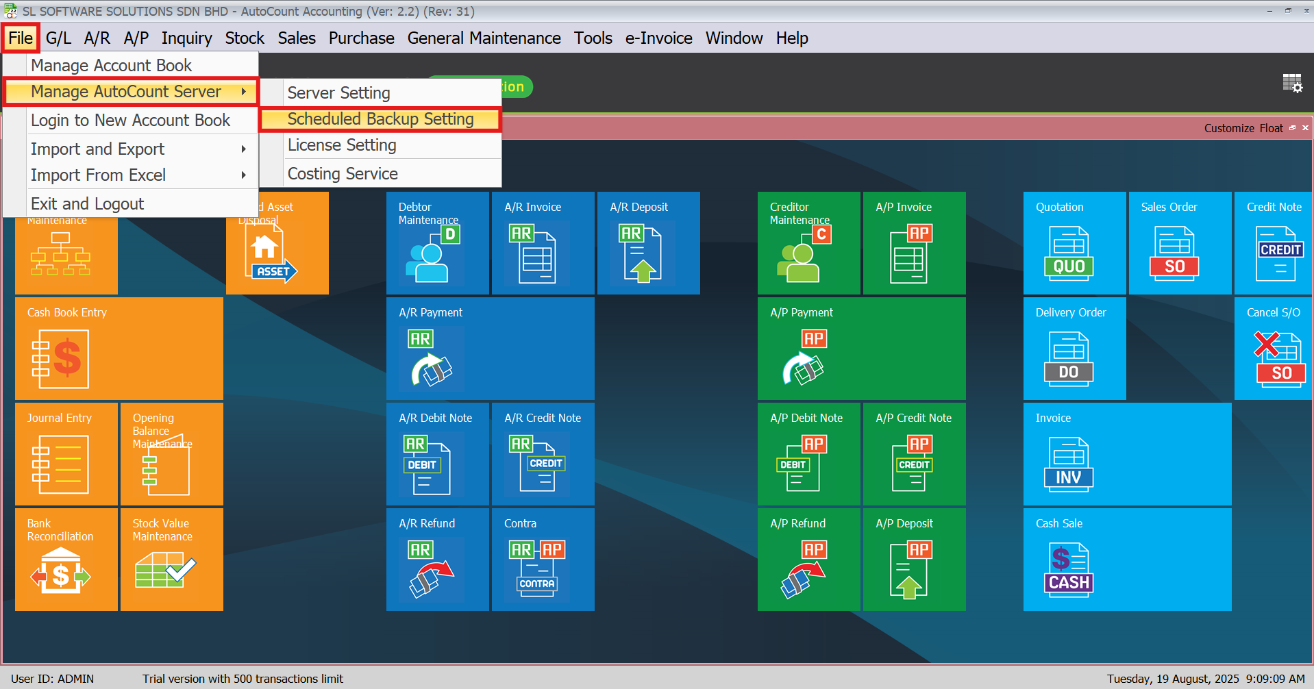 - Go to File > Manage AutoCount Server > Scheduled Backup Setting
