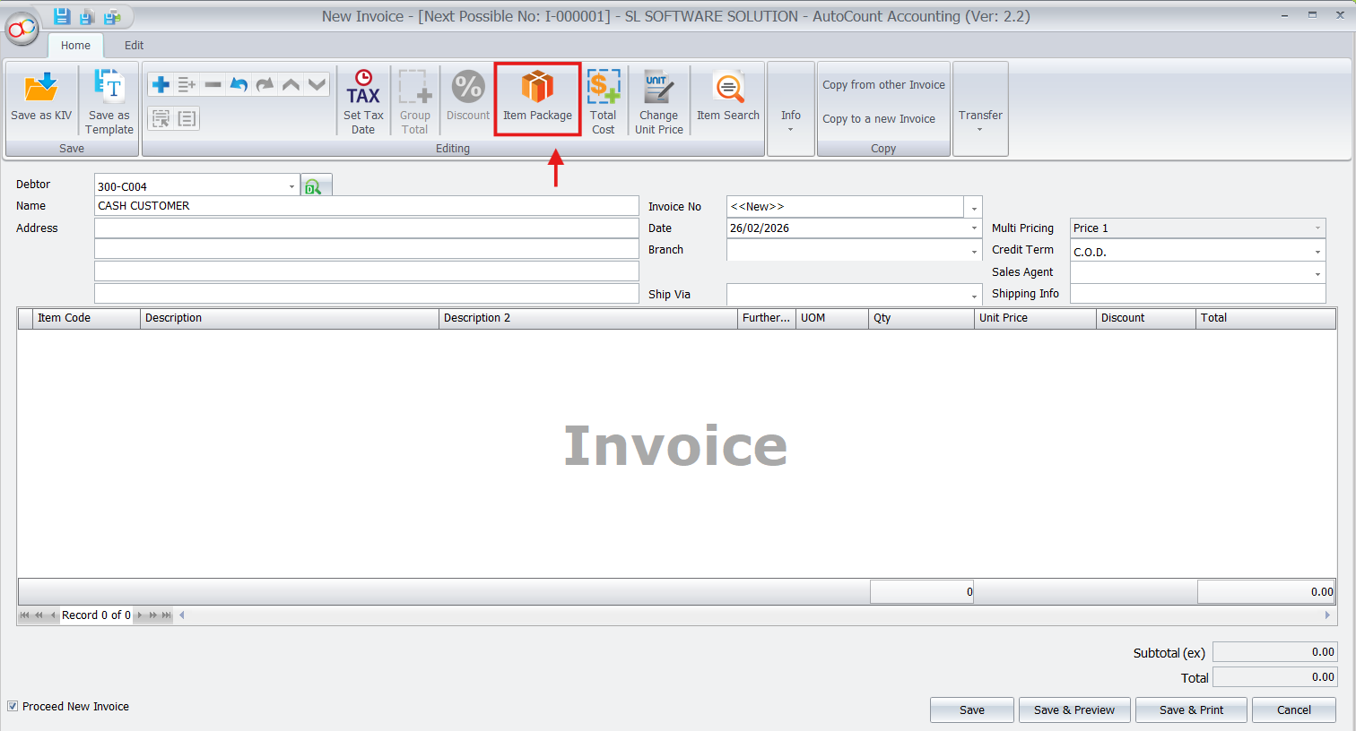 - Add your newly created Item Package code to the invoice.
