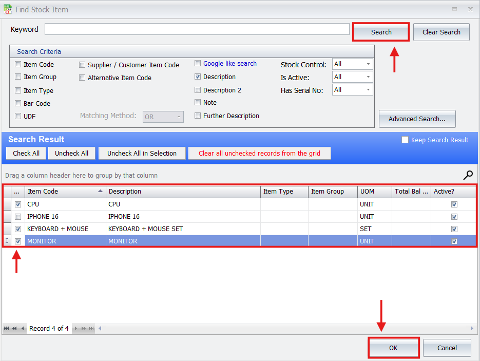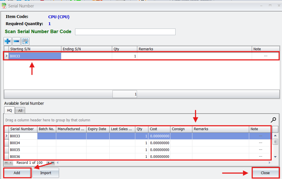 - AutoCount will automatically detect the serial-controlled items within the package and open a prompt window for you to select the specific serial numbers from stock.