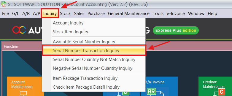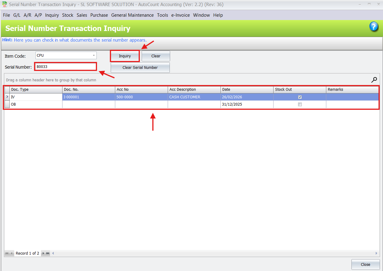 - Go to Inquiry > Serial Number Transaction Inquiry.