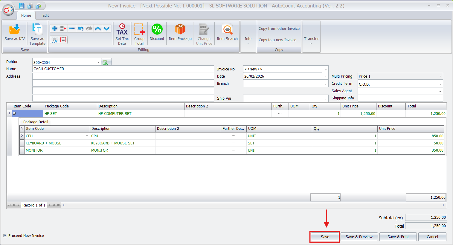 When you add a package to a sales invoice, AutoCount automatically detects any serial-controlled sub-items. It then prompts you to select or input the specific serial numbers for those components, ensuring accuracy at the point of sale.