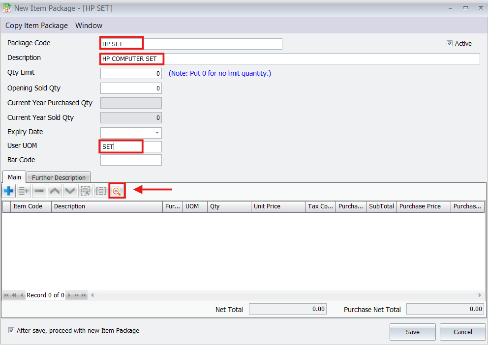 - Enter a Package Code (e.g., “HP SET”) and a Description.