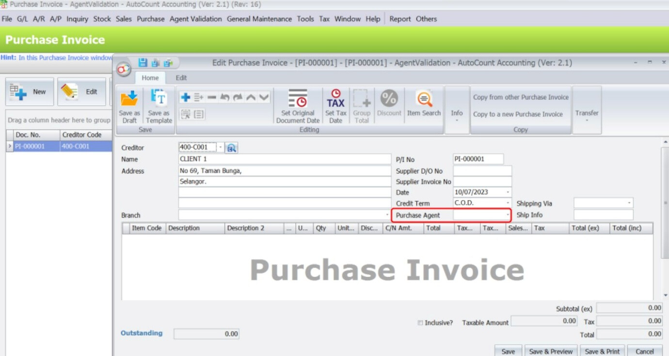 This plugin enhances your AutoCount Accounting system by requiring users to fill in designated agent fields before saving Sales or Purchase documents when selected in the settings. It prevents incomplete entries and ensures essential agent details are captured consistently.
