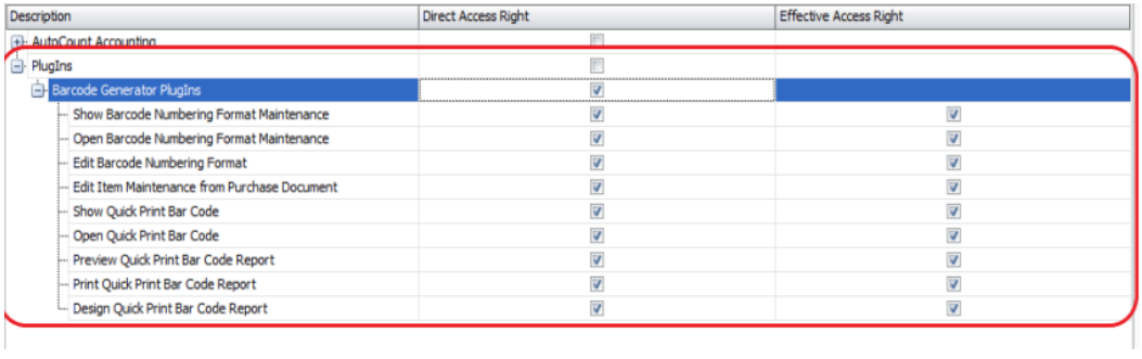 - Tick the Barcode Generator Plugin rights (Direct Access).