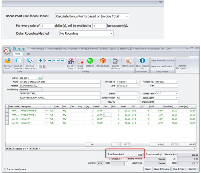 - Go to Tools > Options > Invoicing > Bonus Point.