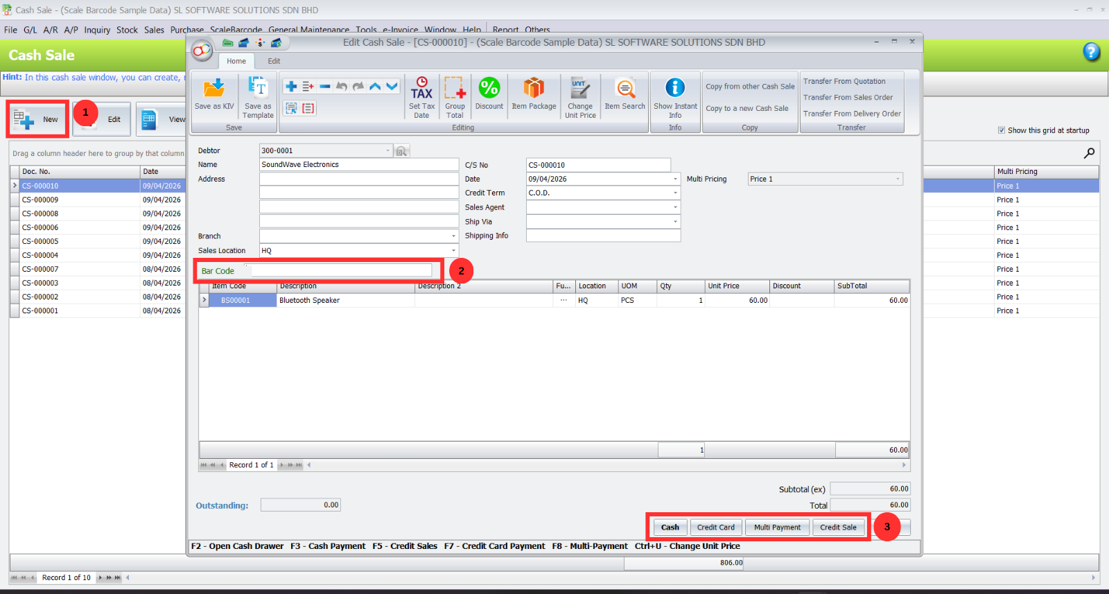 The final stage is the seamless checkout process enabled by the barcode. To record a sale, open the Sales > Cash Sale module in AutoCount POS and select the debtor or customer for the transaction. Instead of manual entry, you simply use a barcode scanner to scan the barcode on the weighed item’s label. Upon scanning, the system instantly decodes the 13-digit number, referencing your earlier format settings to correctly identify the item and its value. This action automatically and accurately populates the entire sales invoice line with the correct Item Code, Description, Quantity, and Price. After scanning all items for the transaction, you can finalize the sale with a single click by selecting the appropriate payment method, such as Cash, Credit Card, or Multi Payment, completing an efficient and error-free checkout.