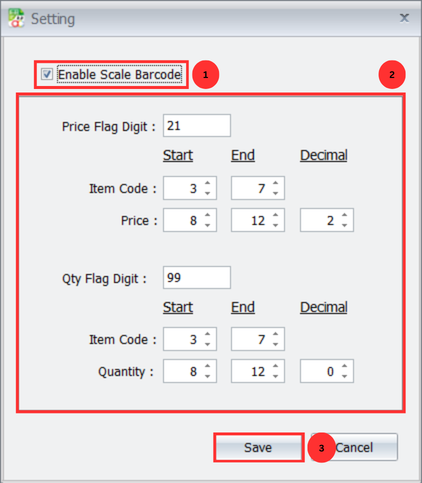 - Set your Flag Digits (e.g., ’21’ for Price, ’99’ for Quantity) and define digit positions.