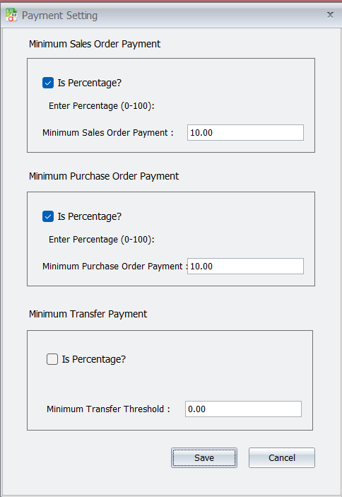 Set Minimum Sales Order Payment: Here, you can set a minimum required deposit for each sales order. This ensures that an order cannot be saved unless the required deposit amount is entered.