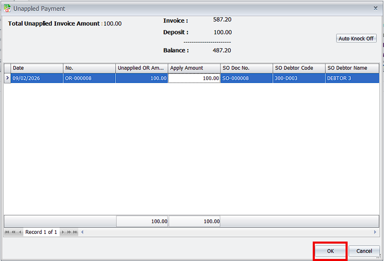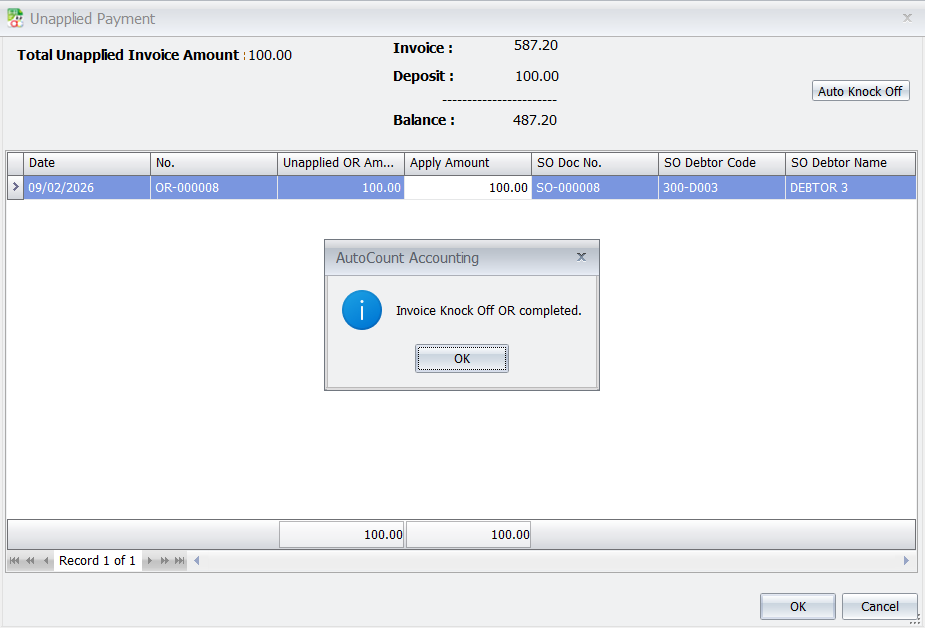 - Automatic Knock-Off: A pop-up window will automatically appear asking if you want to “Knock Off” the deposit against the new invoice. Click OK to apply the deposit to the invoice, leaving only the final balance to be paid by the customer.
