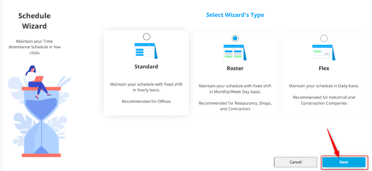 Choose between Standard, Roster, or Flex scheduling method based on your needs.